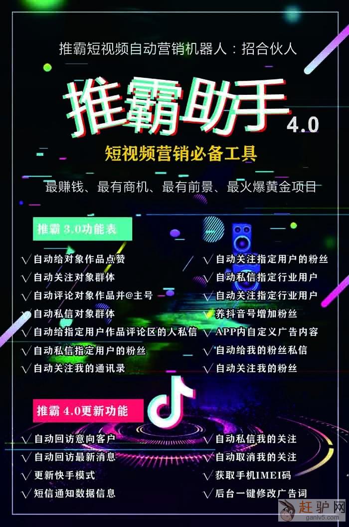 抖音视频营销软件也叫抖音推霸引流软件,是一款超火的短视频引流营销系统,可以通过评论、关注私信、私信群发等,将您的引流广告全方位的展现,增加每一刻的曝光g+a+n+l+v+5+c+o+m。软件快速、稳定、升级及时、引流效果强大!
